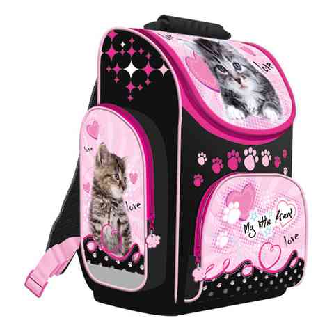 Ez a csodás, fekete alapon rózsaszín mintás, cicával díszített iskolatáska, hátizsák nem csupán esztétikus küllemű, hanem igényes kivitelezésű is, tökéletesen figyelembe véve a gyermekek speciális igényeit. A táska falai merevek, így a súly a gyermek hátán egyenletesen oszlik el. A vállpántok párnázottak, melyek szükség szerinti nagyságra állíthatóak. A táska alja vízálló, ezen felül fényvisszaverő elemek vannak oldalán, melyek a biztonságos közlekedést, a láthatóságot szolgálják. A táska egy fő, cipzárral ellátott rekesszel, és egy kisebb zsebbel van ellátva. A táska oldalán két cica mintázattal ellátott kisebb zseb is van.