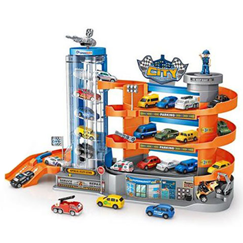 A parkolóházak mindig nagyszerű választások a gyerekek számára, hiszen a sok kisautóval remek játéklehetőséget kínál a számukra. Ennek a parkolóháznak több szintje is van, melyeken az autók leparkolhatnak, de a lejtős pályának köszönhetően akár maguktól is képesek végig gördülni rajta. Az épület legizgalmasabb része a spirál-lift, ami a két darab AA ceruzaelemnek köszönhetően, folyamatos forgással képes a kocsikat az épület legfelső szintjére juttatni. Ahol a kocsi magától elhagyja a liftet és meg is indul lefelé, hogy meglátogassa az alsó szinten kialakított boltokat.