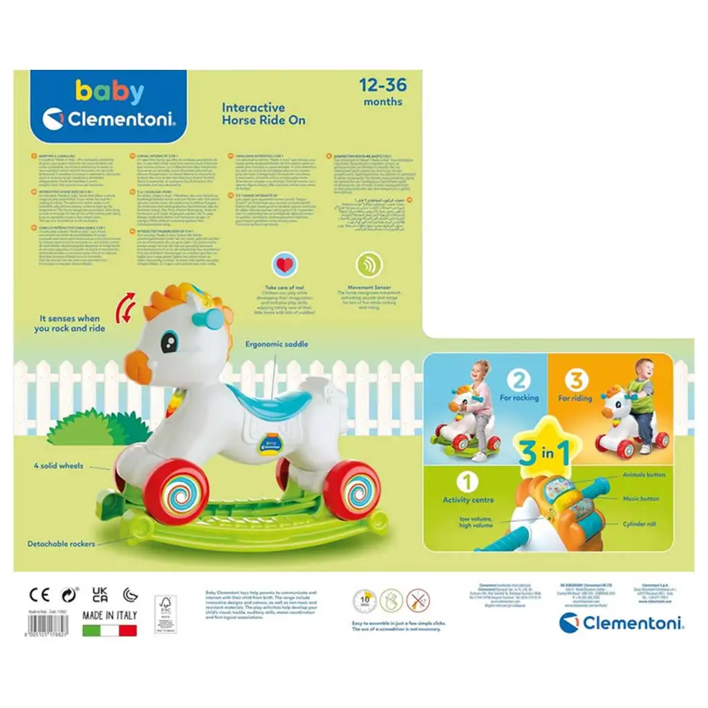 A Clementoni Baby 3 az 1-ben interaktív hinta póni egy igazán különleges játék, amely egyszerre szórakoztat és fejleszt. Ez az aranyos póni nemcsak hintázásra és lábbal hajtható közlekedésre alkalmas, de egy interaktív játékközpont is, amely a kicsik érzelmi és motoros készségeit fejleszti. Ideális választás 12-36 hónapos gyermekek számára, hiszen a három különböző funkció segítségével sokoldalúan használható.