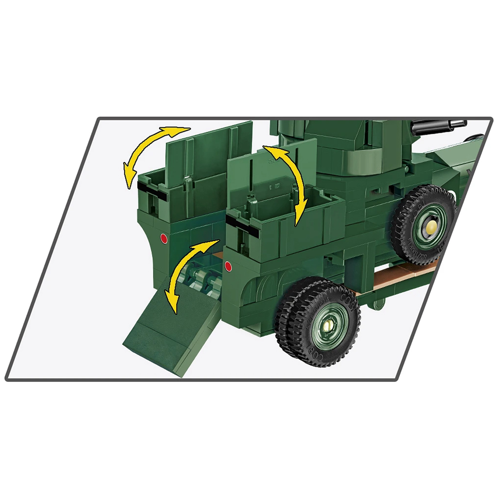 Az építőkészlet részletgazdag kidolgozással készült: forgatható torony mozgatható géppuskával, nyitható ajtók és élethű felépítés teszi különlegessé. A tartós, kopásálló nyomatoknak köszönhetően a modell hosszú időn át megőrzi eredeti kinézetét, matricák használata nélkül. A készlet egy brit katona figurát is tartalmaz, így a jármű játék közben is izgalmasabbá válik. Az összeállítást egyértelmű, illusztrált útmutató segíti, így minden korosztály számára élvezetes az építés folyamata.