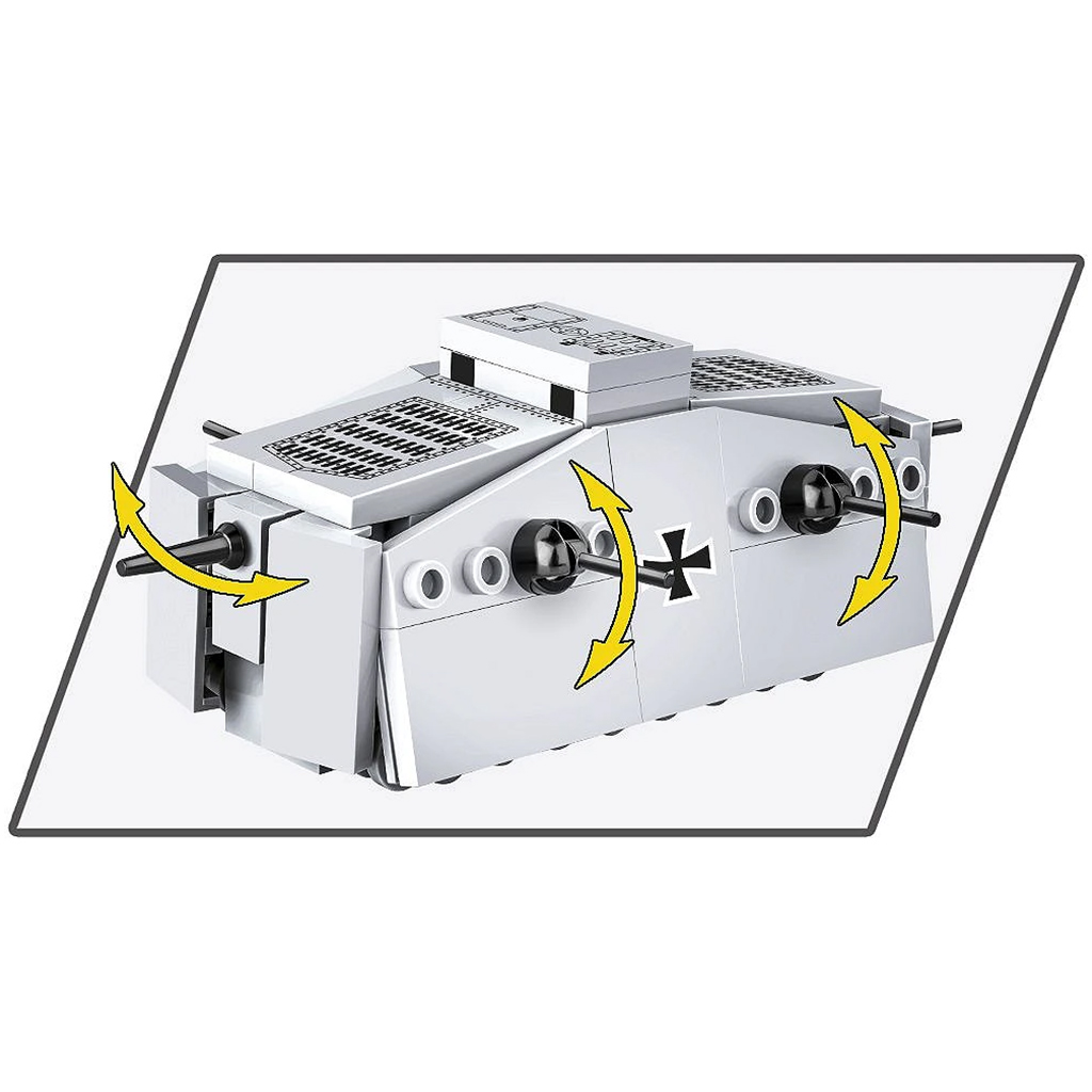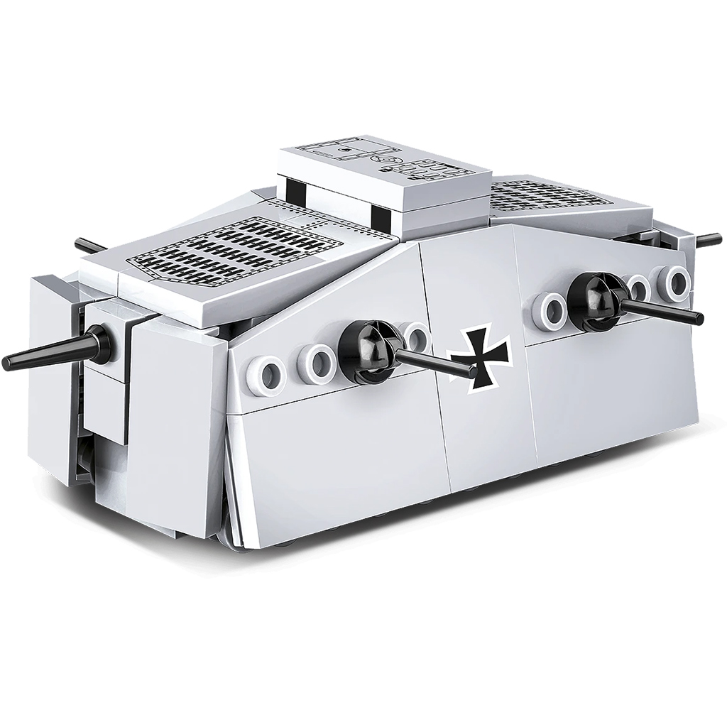 A COBI Sturmpanzerwagen A7V építőkészlet az első világháború egyik legkülönlegesebb páncélosát mutatja be. Az A7V volt az egyetlen német harckocsi, amelyet sorozatban gyártottak ebben az időszakban, és mindössze húsz darab készült belőle. Hatalmas méreteivel és jellegzetes páncéltestével a korszak egyik legismertebb harcjárműveként vált híressé. A modell 1:72 méretarányban készült, 119 darab kiváló minőségű építőelemből áll, a kész jármű méretei pedig 11,5 cm hosszú, 7,5 cm széles és 4,5 cm magas.