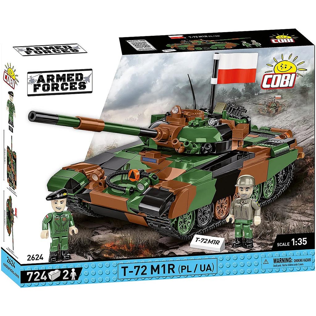 A COBI építőjáték-készlet lehetővé teszi, hogy megépítsd a híres T-72-es harckocsi M1R változatát, amelyet a Lengyel és Ukrán hadsereg használ. A modell 1:35 méretarányban, összesen 724 darab építőelemből áll. A harckocsi kidolgozott részletei között szerepelnek mozgó lánctalp, forgatható torony, mozgatható ágyúcső, és egy nyitható toronyfedél is, ami alatt elhelyezhető az egyik két tartozék katonafigura. A készlet két figuraelemet kínál: egy lengyel és egy ukrán harckocsivezetőt, továbbá zászlóelemeket Lengyelország és Ukrajna zászlajával, valamint egy névtáblát a modellhez.