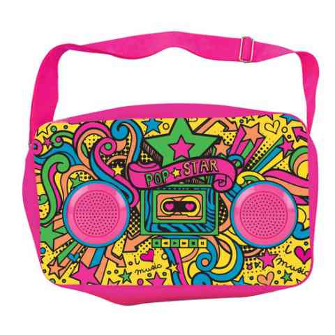 Ezzel a hihetetlenül különleges táskával igazi sztár lehetsz a suliban! A táska fekete fehér kivitelben érkezik és neked kell tetszés szerint kiszínezni a felületét a készletben található 5db filctoll segítségével, melyek most a neon hatás miatt még látványosabb végeredményt biztosítanak. A táska azonban nem csak a külseje miatt egyedi, hanem azért is, ami benne található. Külsőre úgy fest a táska, mint egy rádiómagnó és ez nem is áll messze a valóságtól, hiszen valóban található benne 2db hangszóró, melyeket egy hagyományos Jack-dugó segítségével bármely zenelejátszásra alkalmas készülékre (telefon, MP3, Tablet, stb...) könnyedén csatlakoztathatóak. Ezentúl te leszel a bulifelelős az órák közti szünetekben!
