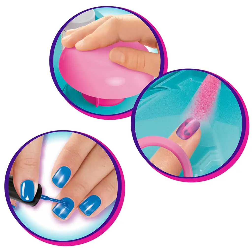 A Shimmer 'n Sparkle Airbrush Designer lehetővé teszi, hogy könnyedén létrehozz átmenetet a körmökön, köszönhetően a festékfújónak. Egyszerűen lakkozd be a körmeidet, majd hagyd szabadon a kreativitásodat és kezdd el létrehozni a saját designjaidat fújóval. Az Airbrush Designer nagyon könnyen használható. Nyomd meg a nagy rózsaszín gombot a permetezés aktiválásához. Helyezz egy ujjat a fedett területre, így a festékszóró permetezése csak egy körömre fog vonatkozni.