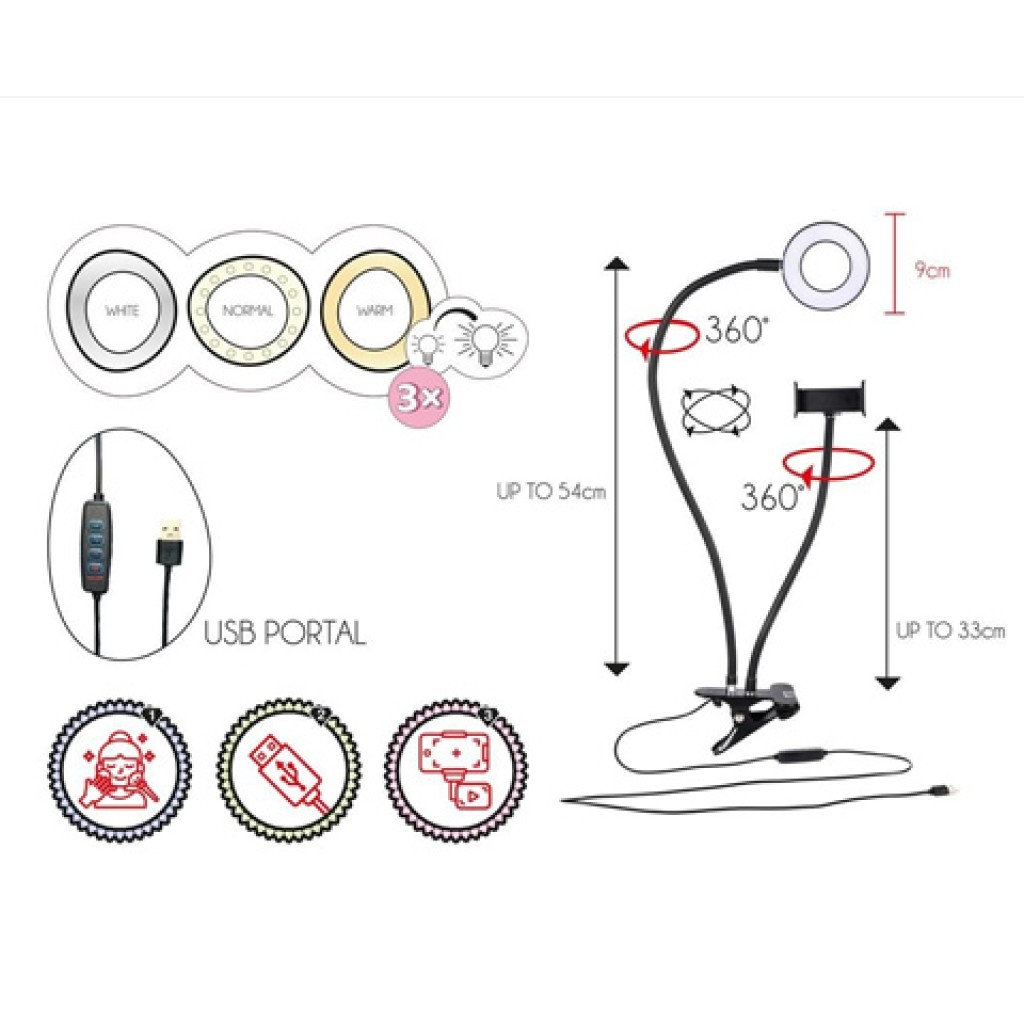 Gyermeked érdeklődik a videó készítés iránt? Lepd meg őt az első stúdió szettjével, mely nagy segítség lesz számára ebben. A csomagban egy csíptethető telefontartó állvány található, melyen még egy körlámpa is helyet kapott. Ezek mindegyike 360 fokban forgatható, így biztosan megtalálja a megfelelő szöget a videó elkészítéséhez, a lámpa pedig megfelelő fényt biztosít hozzá, ráadásul állítható hogy hideg fehér, normál vagy melegfehér fényt adjon. A lámpa dugója USB kábellel csatlakoztatható áramforráshoz, így praktikusan használható.