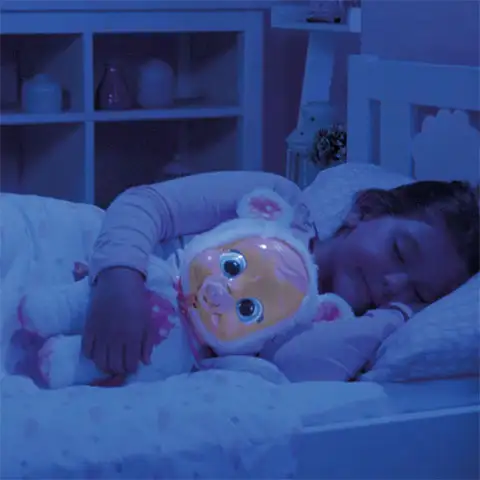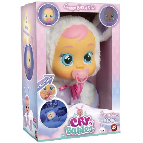 A Cry Babies babák hatalmas kedvencek a kislányok körében, ami nem is csoda, hiszen a cuki babák első pillantásra belopják magukat a szívükbe, ráadásul a hatalmas könnyeikkel mindenkinek meg tudják lágyítani a szívét. A Cry Babies Jó éjt Coney baba különkiadás, ami még inkább elnyeri majd a kicsik tetszését. A puha testű baba nem csak nagyszerű játék, hanem segíti a gyermek elalvását is. Coney puha, bolyhos tapintású pizsamát visel, és ha megnyomjuk a baba hasát, akkor tíz percig egy kellemes és anadlító altatodalt játszik. Amikor kivesszük a cumit Coney szájából, a baba elkezd sírni, és az arca világítani kezd a sötétben csillogó könnyektől. Amikor visszatesszük a cumit, a baba már nem sír és az arca világítani fog.