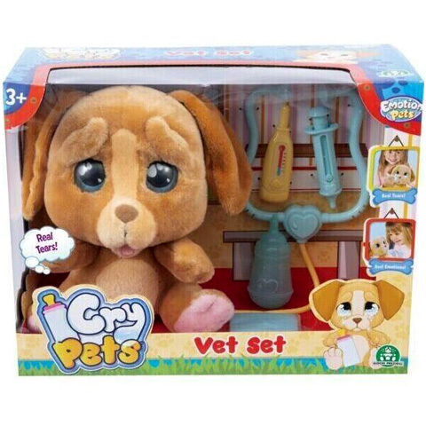 A legtöbb kisgyerek rajong a kutyákért, így a cuki Cry Pets plüss kutyus garantáltan nagyon népszerű játék lesz, hiszen nem csak puha és finom plüss anyagból készült, hanem a valódi könnyekkel is képesek meglágyítani a szívüket. A csomagban egy nagyon aranyos plüss kutya és néhány orvosi felszerelés is található, így a gyerekek állatorvosként is játszhatnak a kis kedvenceikkel. A kis szeretetgombóc mellett található egy cumisüveg, amiből a kutyus ihat és időnként képes arra, hogy pityergéssel vonják magukra a gyerekek figyelmét és törődését.