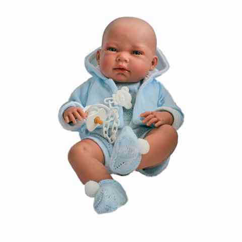 Bármely kislány szívesen játszana ezzel a csodálatos babárval, melynek ruhája, neméhez igazodva, kék alapszínre épül. A rugdalózó anyagában mintázott, ahogy a pom-pommal díszített zokni is. Az igényességet tükrözi, hogy a kapucnis kabátkának még bélése is van. A kisfiú baba tartozéka egy cumi, mely csíptetős cumilánccal van ellátva, biztosítva azt, hogy a cumi ne vesszen el. A baba végtagjai és feje kétirányú mozgásra képes, mely lehetővé teszi, hogy a baba önállóan üljön. A játék, anyagában megfelel minden szigorú előírásnak.