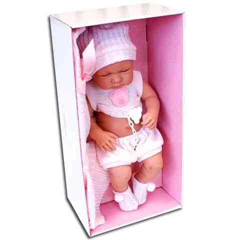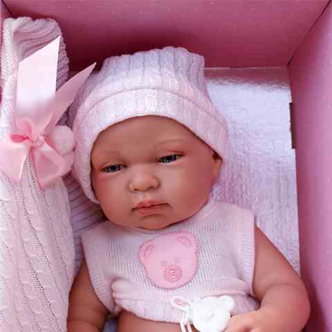 Dédelgetésre hív ez a csodálatos, öltözékében, kivitelezésében igényes, részletgazdag játék csecsemő baba. A baba ruházata könnyed, hurkolt anyagból készült, melyet ennek okán igen könnyű kezelni. A baba ruházata a klasszikus értelemben vett csecsemő ruházat darabjaiból áll. A hosszú nadrág alján lévő kockás minta megjelenik alapmintaként a hosszú ujjú felsőn, melyet a fehér gallér tesz ünnepélyessé. A sapkán és zoknin lévő pom-pom díszítés játékos látványt nyújt. A baba végtagjai és feje két irányba mozdíthatók. Tökéletes ajándék lehet ez a baba, hiszen játék közben fejleszti a gyermek ízlésvilágát is.