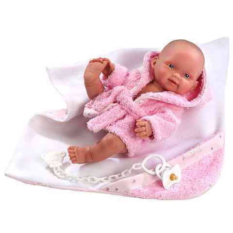 Szeretnél egy babát ami pontosan olyan mint az igaziak? Akkor ez a kiváló minőségű spanyol termék tökéletes választás számodra. A csöppség ugyanis rendkívül részletgazdag és élethű tervezésű, ezért nagyon hasonlít az igazi gyermekekre. Rózsaszín fürdőköntösére cumit csíptethetsz, a pancsolás után pedig a saját kis takaróján törölheted szárazra. Teste teljes egészében kellemes tapintású műanyagból készült. Végtagjai mozgathatóak, így akár fel is ültethető. A babával a kislányok átélhetik az anyai gondoskodás élményét.