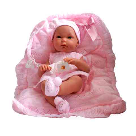 Ezt a szép játékbabát azoknak a gyermekeknek ajánljuk, akiknek közelében nem sokára újszülött érkezése várható. A baba ruházata ugyan azokból a darabokból áll, melyekből egy klasszikus csecsemő ruházata, pom-pommal díszített sapka és zokni, tunika és kis nadrág. A baba tartozéka még egy cumilánccal allátott cumi is. Ehhez a csodálatos csecsemő babához tartozik továbbá egy puha, töméssel ellátott takaró is, mely a ringatás élményét még komfortosabbá teszi. Tökéletes választás ez a játék azoknak a kislányoknak, akik imádnak babázni.