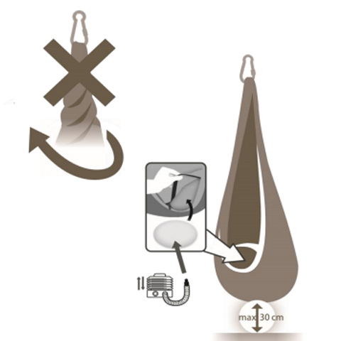 A függőszék felfüggesztéséhez felfüggesztési pont szükséges akár a mennyezetből, egy fa végtagból vagy egy gerendából. Minimális helyet igényel, kisebb gyerekszobákba is elfér. Egy egyszerű lépésben eltávolítható, amikor már nincs rá szükség.