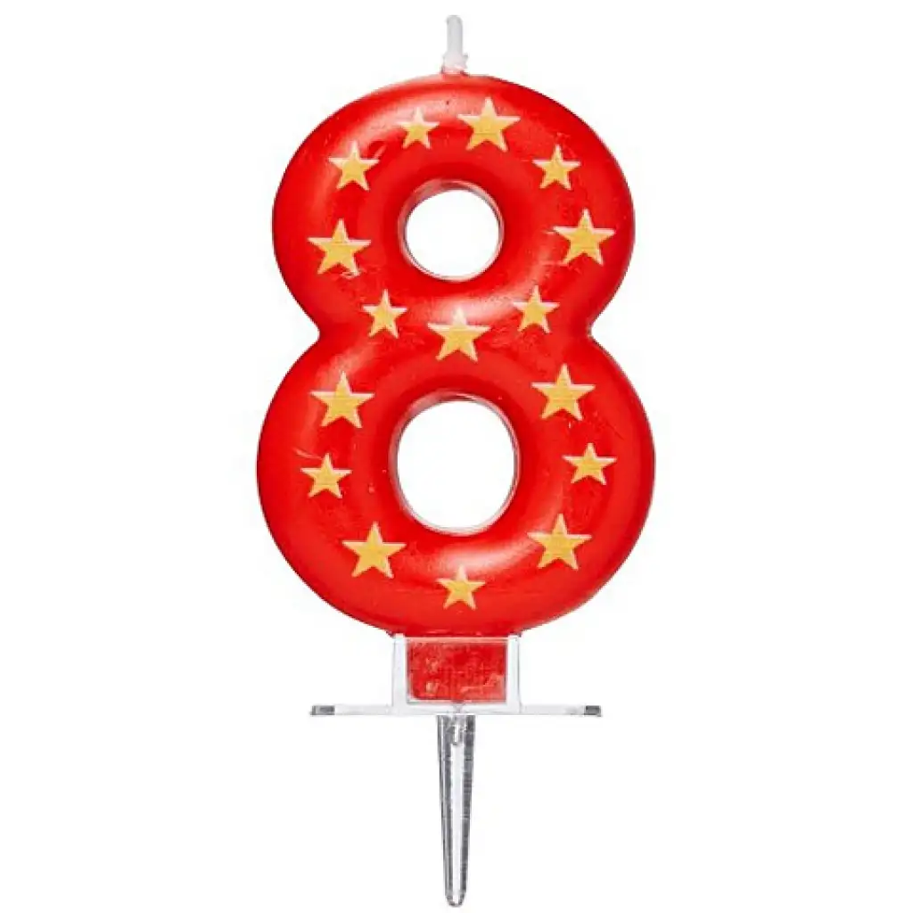 Egy remek hangulatú bulit szervezhetsz a nyolcadik születésnap alkalmából, melyhez természetesen elengedhetetlen kellék a szülinapi torta és az arra kerülő számgyertya is. A piros alapszínű viasz gyertya sárga csillagokkal dekorált, így megfelelő dekorelem is a kicsiknek. A műanyag talpat használva egyszerűen beszúrható a torta tetejébe, ami aztán stabilan állni fog.