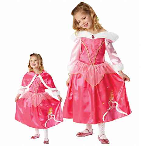 - egyrészes Csipkerózsika jelmez a szoknyán nyomtatott Csipkerózsika fotóval, nyakán és a karján szőrmével, és válltakaróval