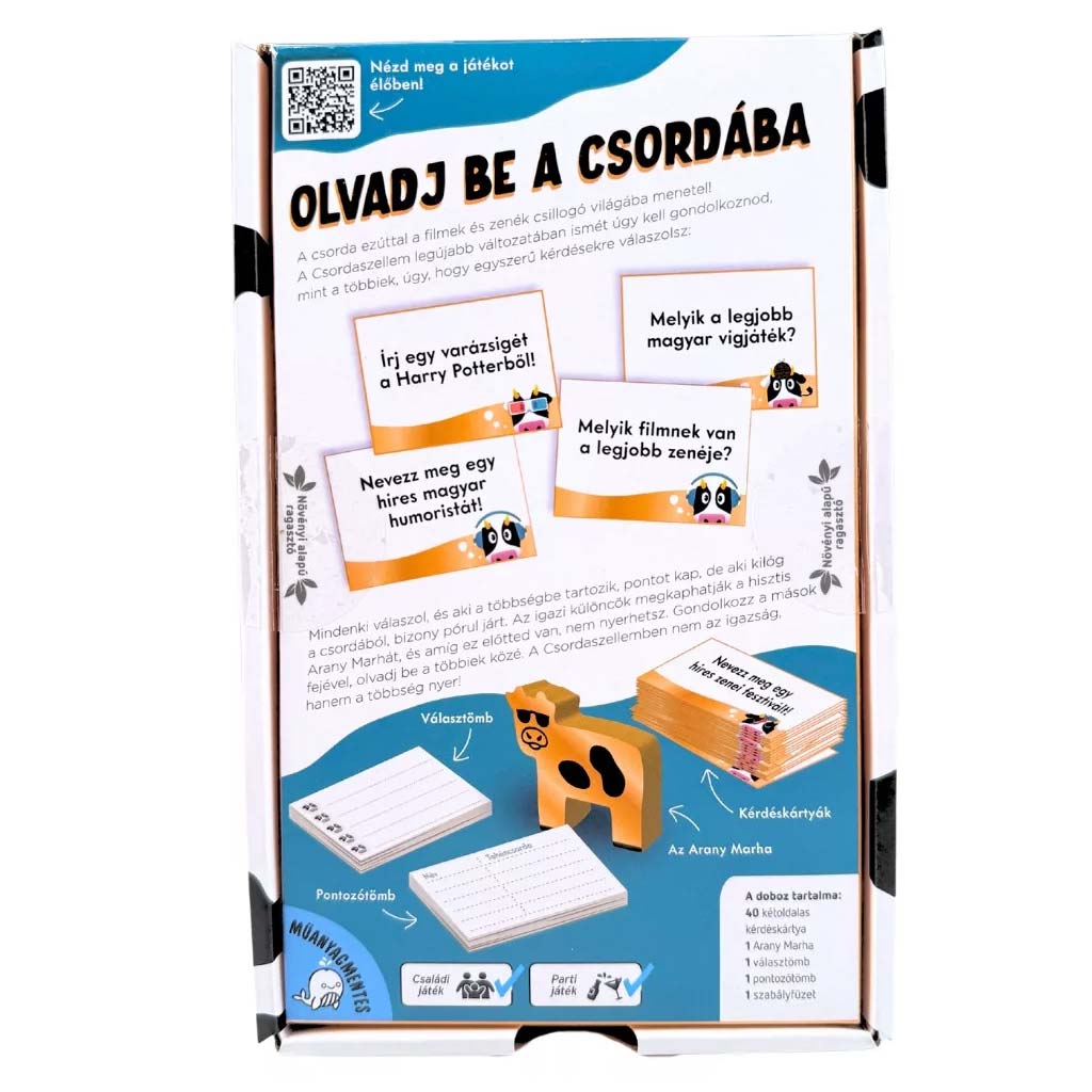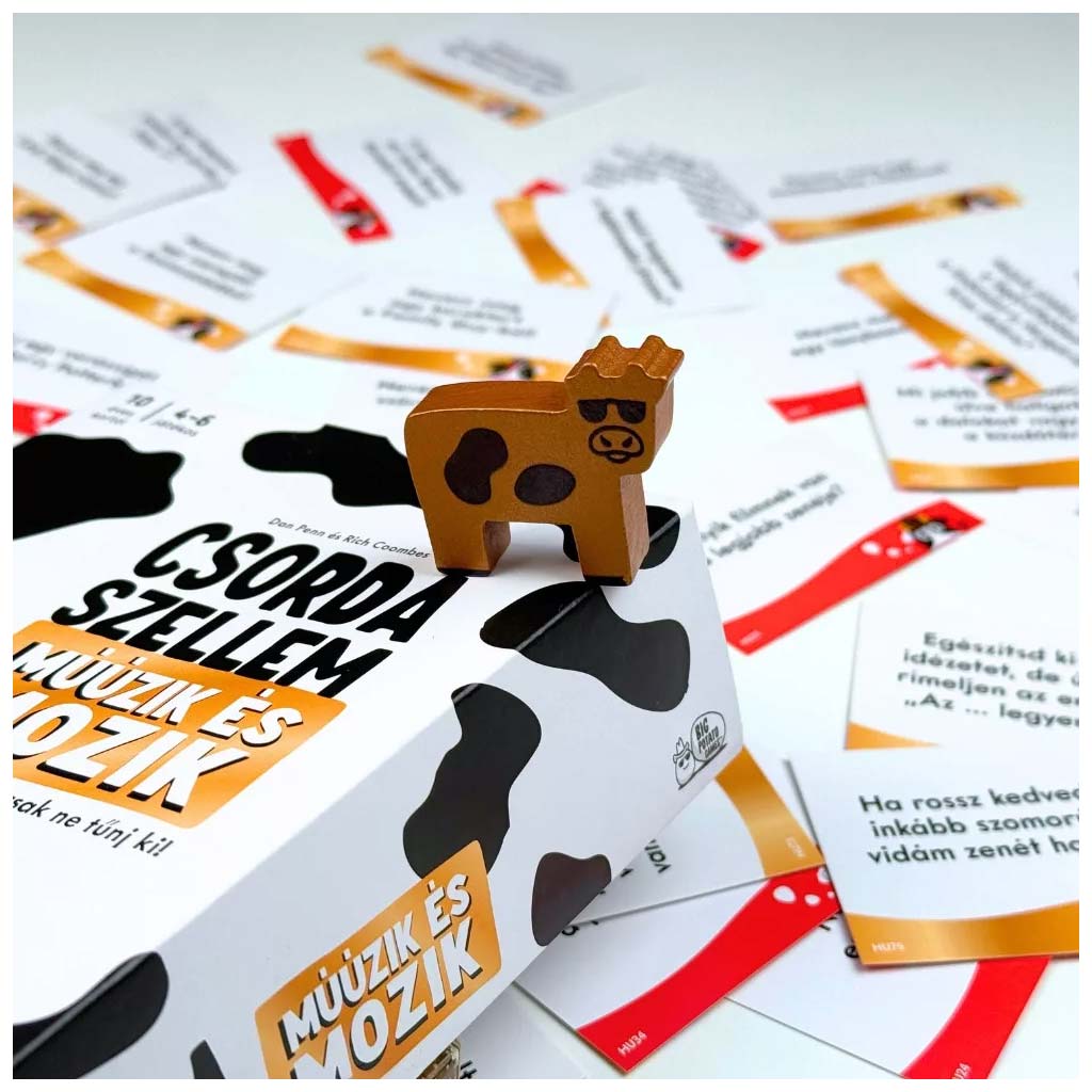 A Csordaszellem – Múúzik és Mozik könnyen tanulható, gyors körökkel játszható, mégis minden partijában újabb meglepetéseket tartogat. Ideális választás baráti összejövetelekre, családi estékhez vagy bármilyen alkalomra, ahol garantált a hangos nevetés és az „ezt nem hiszem el” pillanatok sora. Ez a játék bebizonyítja, hogy néha a legjobb stratégia az, ha pontosan úgy gondolkodsz, mint mindenki más.