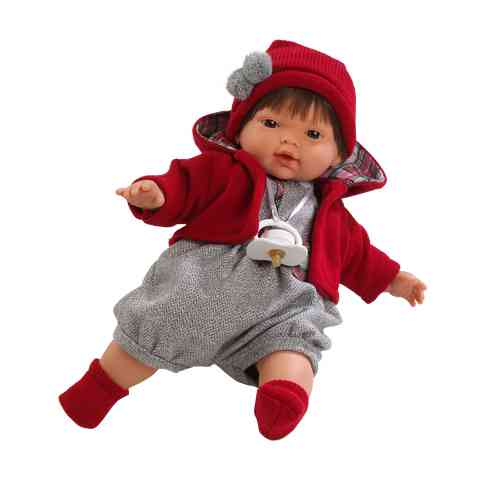 Ez a csodás kisfiú baba minden kislány álma. Az élénk piros szín csodásan, mutat a komoly, szürke rugdalózó mellett. A sapka pom-pomja, a kapucni kockás bélése miat sokkal babásabb, mégis fiúkhoz méltóan komoly is. A ruha könnyen kezelhető anyagból készült, így könnyen tisztítható, könnyen levetkőztethető. A baba teste textil, ebben van, elérhető helyen a szerkezet, mely miatt a baba képes síró hangot kiadni. Ezt a baba nyakában lévő cumival tudjuk megszüntetni. A baba, ízléses kinézete miatt nívós játékélményt képes nyújtani a gyermeknek.