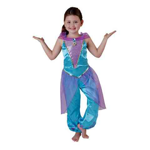 Jázmin hercegnő jelmeze az arab népmesék világába kalauzol el minket. Éppen ezért ez az egyik legkülönlegesebb lány jelmez. Alapszíne türkiz, amit lila tüllel kombináltak. Ujjatlan felsőből, és selyemszatén, lila, apró mintás, húzott aljú nadrágból áll ez a jelmez. Hitelesen idézi fel a ruha Aladdin és Jázmin hercegnő csodás, varázsos és kalandos történetét.