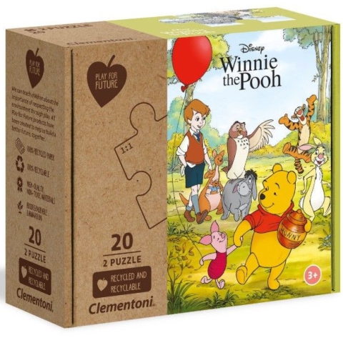 A Disney egyik legnépszerűbb meséje a Micimackó, mely a kissé együgyű, ám annál aranyosabb medvebocsról és kedves barátairól szól. Ez a csodás kirakó tökéletesen megmintázza a mese felejthetetlen jeleneteit a gyerekek nagy örömére. A Clementoni 2 x 20db-os puzzle szettben 2db fantasztikus kirakó található, mely biztosan elnyeri majd kicsik és nagyok tetszését egyaránt. Azok számára, akiknek fontos a környezetvédelem biztosan remek hír, hogy a kirakó teljes mértékben újrahasznosított és újrahasznosítható alapanyagból készül. A kirakott képek mérete egyenként 27x19cm-es. A képek összeállítva remek díszei lehetnek a szobának.
