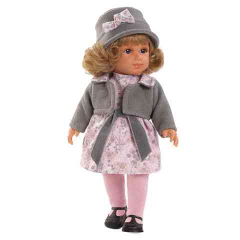 A lánybaba különlegessége, hogy a ruha mintájával azonos passztell színű, virágmintás masnival van díszítve kalapja. A rózsaszínt, mint alapszínt, visszafogottá teszi a halványszürke. A ruha virágokkal teli mintázata játékossá teszi az összhatást. Ez a virágminta a kabátka gallérján is visszaköszön. Romantikusabbá teszi a látványt a ruha derekán függő szürke szatén szalag. A baba öltöztethető, ez nem csak plussz játék örömöt nyújt, hanem lehetővé teszi a játék egyszerű tisztán tartását. A játékbaba fésülhető.