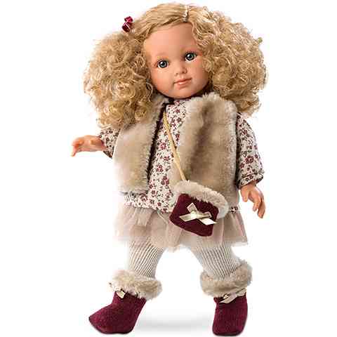 A díszdobozban érkező Llorens babák mindegyike a legmagasabb minőséget képviseli. Elena csodaszép göndör hajkoronája, és igéző kék szeme már önmagában is elegendő ahhoz, hogy hatalmas örömet szerezz kislányod számára megvásárlásával. Elena virágos ruhácskáján egy szőrme mellényt visel, mellyel színben tökéletesen harmonizál a tüllszoknya. Prémes csizmája, illetve retikülje ugyanúgy festenek, ez teszi a lány baba megjelenését igazán trendivé. A bordó szín nem csak a kiegészítőkön jelenik meg, hanem a baba hajdíszén is, így téve tökéletessé a szettet.