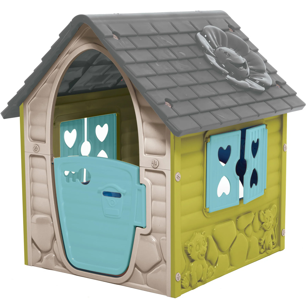 A játszóház barátságos és vidám kialakítású: félmagas, nyitható-kilincses ajtóval, szívecskés ablakredőnyökkel és díszes tetővel, amelyen egy mosolygós virág is helyet kapott. Az oldalakon aranyos kisállatdomborművek díszítik a falakat, így még hívogatóbbá válik a játék. A masszív, időjárásálló műanyag szerkezet biztonságos és tartós, így nyugodtan elhelyezheted a kertben is, akár egész évben.