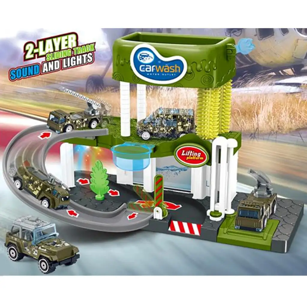 Emeletes autómosó katonai járművekkel, fénnyel és hanggalEmeletes autómosó katonai járművekkel, fénnyel és hanggal