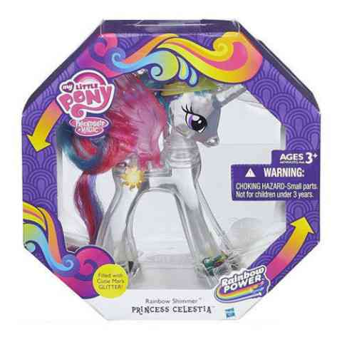 Most egy igazán különleges kicsi pónival gazdagíthatod a gyűjteményedet! A lélegzetelállító Celestia hercegnő különlegessége, hogy teljesen áttetsző és színpompás csillámformák úszkálnak benne, ha fejjel lefelé fordítod. A póni haja fésülhető, feje pedig forgatható. Hatalmas szárnyai és koronája szemet gyönyörködtetővé teszik Celestiát. A Rainbow Power sorozat tagjaként szivárvány mintás sörénnyel és csodaszép napot mintázó szépségjeggyel érkezik hozzád!