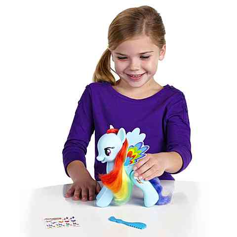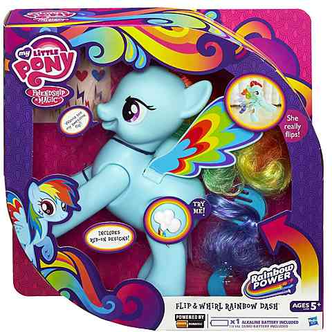 Rainbow Dash nem csak színpompás sörényével hívja fel magára a figyelmet, hiszen a különleges póni akár szaltózni is képes! A hatalmas ugrással Rainbow Dash minden gyereket elkápráztat, akik vidáman figyelik majd a produkciót. A színes póni lábán lévő gombot megnyomva hallhatod a hangját is, valamint a feldörzsölhető matricákkal még látványosabbá teheted külsejét.