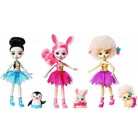 Egy varázslatos, színes világba kalauzolnak el ezek a csodaszép Enchantimals balerina babák, akik egy-egy állat külső jegyeit is magukon viselik. Lorna Lamb, Preena Penguin, Bree Bunny a bárány, pingvin és nyuszi megjelenésével érkezik hozzád, valamint a házi kedvenceiket is magukkal hozzák. A balerina babák végtagjaik mozgathatóak, ezáltal a kislányok élethűen tudják pozícióba állítani őket. Kezdődhet a csodás kaland?