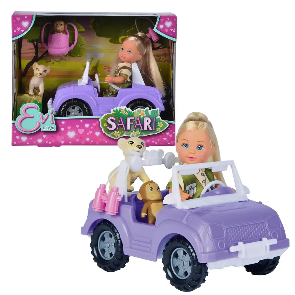 Évi Love baba egy igazi felfedező ruhában, terepszínű dzsekivel és hozzá illő kiegészítőkkel várja, hogy belevágjon a kalandokba. A szett tartalmaz egy távcsövet is, amellyel Évi megfigyelheti az állatokat a szafari közben, így a gyerekek még valósághűbb játékélményben részesülhetnek. A két kis állat, az oroszlánkölyök és a majom, bájos társak a kalandok során, és segítenek a gyerekeknek elmélyedni a szerepjátékban.