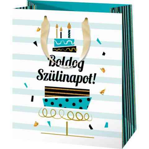 Exkluzív Boldog születésnapot feliratos torta mintás közepes ajándéktáska 18x23x10cmExkluzív Boldog születésnapot feliratos torta mintás közepes ajándéktáska 18x23x10cm