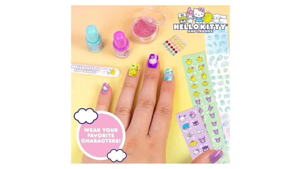 A Csillámló Körömművészeti készlet négy élénk, vízbázisú körömlakkot tartalmaz a Hello Kitty színeiben: Hello Kitty rózsaszín, Kuromi lila, Cinnamoroll kék és PomPomPurin sárga. Mivel a lakk vízbázisú, a felnőttek értékelni fogják, hogy nincs szükség erős körömlakk-eltávolítóra. A termék azt is állítja, hogy a lakk vegán-barát formulákból és tiszta szépség-összetevőkből készült, amelyek mentesek a parabénektől, ftalátoktól és kemény vegyszerektől.