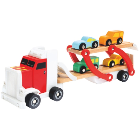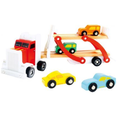 Igen impozáns látványt nyújt ez a jókora nyerges kamion, mely egy autószállító pótkocsit vontat, ami természetesen telis-tele van autócsodákkal. A kamion 37cm hosszú a pótkocsival együtt, így remekül lehet majd vele játszani. A pótkocsiról levehetőek az autók, melyek közt kettő személyautó és kettő sportkocsi található. A kamion nagy része minőségi festett fából készült, míg a kiegészítő elemek strapabíró műanyagból vannak. Az autók közül mindegyik különböző színű, hogy könnyebb legyen megkülönböztetni őket.