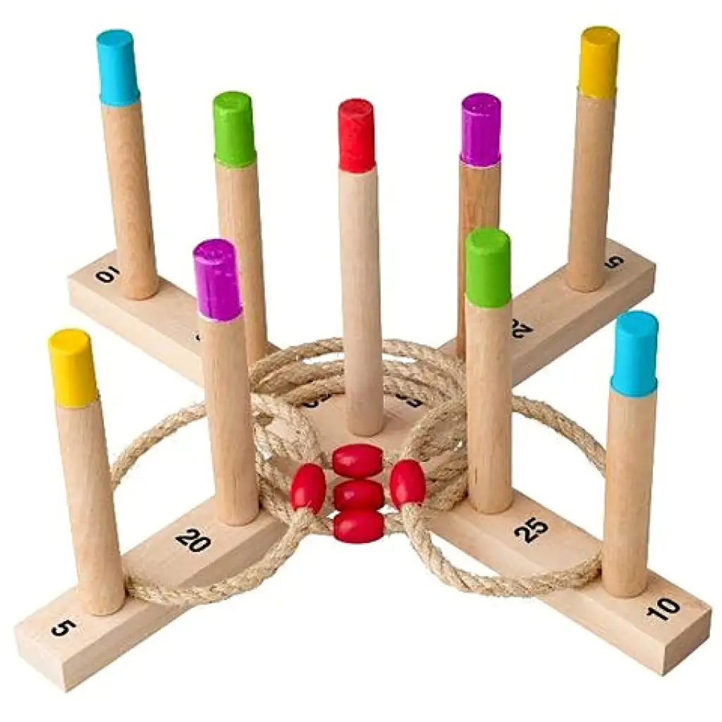 Célozz és dobd pontosan a kis karikákat, hiszen ebben a játékban csakis a jó dobásokkal kerülhetsz közelebb a győzelemhez! A fából készült karikadobálós játék a szabadban vagy a szobában is használható, a játék garantáltan megalapozza a vidám hangulatot. Az egyes pálcák más-más összeget rejtenek, így egy elvétett dobással könnyen hátrányba kerülhetsz. Vajon sikerül a legnagyobb értékű piros rúdra dobnod a karikákat?