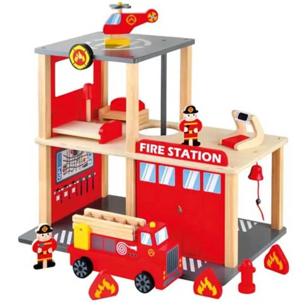 Ez a menő tűzoltóállomás fából készült, így biztos lehetsz benne, hogy nem csak káros anyagoktól mentes, hanem még nagyon időtálló játék is, mely rengeteg kiegészítőt tartalmaz a gyerkőcök legnagyobb örömére. A tűzoltóállomás tetején helikopter leszállópálya található, mely lehetővé teszi az extra gyors mentést. A tűzoltók sebes járgánya kinyitható létrával segíti őket a magas épületek esetén, így nem ütközhetnek semmi akadályba. A tűzoltók a sok munka közepette rettentően elfáradnak, ezért jól jön a központban egy pihenő szoba, ahol lazulhatnak a következő bevetésig.