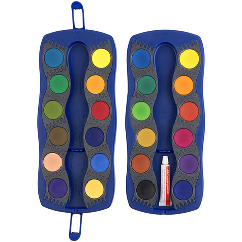 Ez a készlet remek lehetőséget ad a kis művészeknek arra, hogy mindig csak a szükséges színek legyenek előkészítve, hiszen az egyes festék korongok olyan műanyagra kerültek, amelyeket egyszerűen össze lehet illeszteni, biztosak lehetünk abban, hogy a valóban használt darabok mindig kéznél lesznek. Az egész készlet egy rendkívül praktikus, két szintes műagyag dobozban kapott helyet, így kényelmesen és biztonságban lehet szállítani akár a táskában is. A magas pigment tartalmú festékek nem csak nagyon élénk színűek, hanem nagyon jól is fednek, így öröm velük dolgozni.