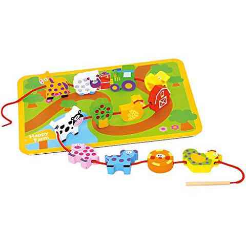 A farm figurás fűzős játék hatékonyan fejleszti a kisgyermekek szem-, illetve kéz koordinációs készségeit. A színes, fából készült játék lényege, hogy a kicsik a zsinórt átfűzzék egyenként a mókás ábrázolással ellátott állatokon, fán, illetve traktoron, így azokat összekötve együtt eljussanak a farm útvonalához. A játék fejleszti a gyerekek önbizalmát is, hiszen sikerélményben részesülnek, mikor a játék végén az összes elemet összefűzték, melyet követően fantáziájukra bízhatják annak folytatását.