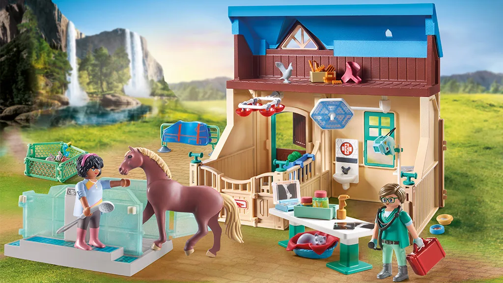 Ez a 164 darabos készlet mindent tartalmaz, amire a gyerekeknek szükségük van ahhoz, hogy saját állatorvosi klinikát hozzanak létre a Waterfall Ranch-on található kancák, csikók és egyéb állatok gondozására. Tökéletes az imaginatív játékhoz, a készlet tartalmaz egy játék röntgengépet röntgenképekkel, egy futópadot a lovak számára, egy medencét vízterápiához és még többet.