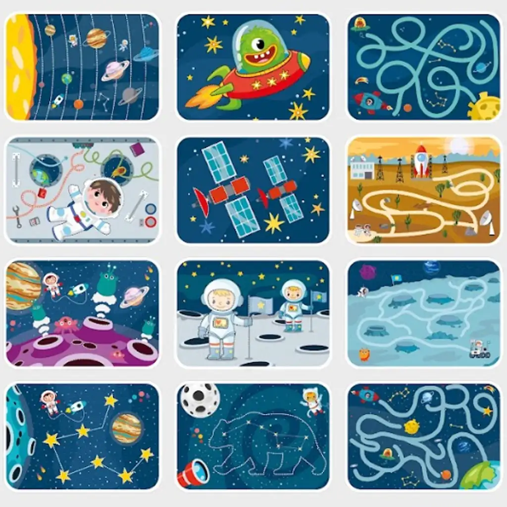 A csomag 16 darab kétoldalas kártyát tartalmaz, tele változatos feladványokkal, mint például útvesztők, pontösszekötések, vonalvezetési gyakorlatok és minták kiegészítése. A letörölhető filcnek köszönhetően a gyerekek újra és újra nekivághatnak a feladatoknak, ami biztosítja a hosszú távú használatot és a végtelen játékélményt. A kártyákon szereplő vidám, űrhöz kapcsolódó illusztrációk, például űrhajósok, űrlények és rakéták, garantáltan magával ragadják a gyerekek fantáziáját.