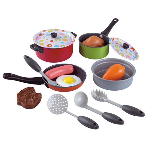 Ez a nagyszerű játékszett a gyerekek játék konyhájának legnépszerűbb készlete lehet, hiszen a fém edénykészlet műanyag kiegészítőkkel minden megjelenésében hihetetlenül hasonlít arra, melyet a felnőttek is nap, mint nap használnak a főzés során. A készletben egy hagyományos és egy nyeles lábas, valamint egy nyeles serpenyő várja, hogy a kicsik használatba vegyék és elkészítsék vele a legfinomabb fogásokat. A műanyag kiegészítők között zöldségek és húsok szerepelnek, melyeket "megfőzve" jól fognak mutatni a vacsoraasztal terítékén. négyféle kiegészítő kelléket is megtalálsz a készletben, melyek a kész ételek szedéséhez szükségesek.