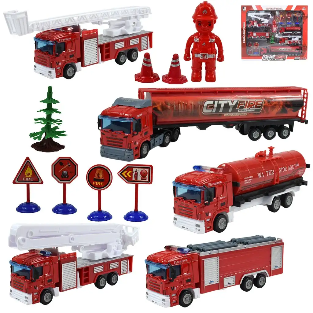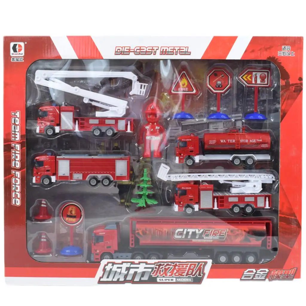 A tűzoltó játékszett tartalma kiemelkedően gazdag és változatos. Az összeállítás a következőket tartalmazza: egy kamion, két létrás tűzoltókocsi, egy tartályos tűzoltókocsi, egy tűzoltó teherautó, két útlezáró bója, négy különböző tábla, egy figura és egy fa elem. A különféle járművek és a számos kiegészítő lehetőséget adnak a gyermekeknek, hogy kreativitásukat és képzelőerejüket kibontakoztassák, és különféle mentőakciókat játsszanak el.