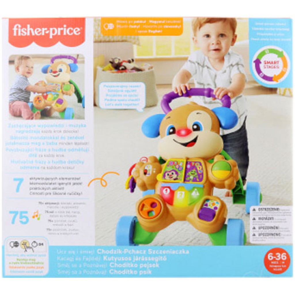 Babád már elmúlt féléves? És egyre jobban érdekli a körülötte lévő világ? Lepd meg őt sok új vizuális, hang- és tapintás-ingerrel a neves Fisher-Price márka interaktív játékának köszönhetően. Ez a népszerű és aranyos kutyusos járássegítő a kisgyermeknek biztonságos támaszt és motivációt nyújt az első lépések megtételéhez, akár már néhány hónapon belül. Az interaktív kutyusos járássegítő rengeteg mondókát és dalt mesél a gyerekeknek, megismerteti velük a teljes ábécét, megtanítja őket a színekre és a számokra. A nyelv megadásához nyomd meg a földgömb gombot, tartsd lenyomva 4 másodpercig, majd válaszd ki a nyelvet. Ez lehetővé teszi, hogy a járássegítő a ti nyelvetekhez igazodjon. A Fisher-Price kutyusos interaktív járássegítővel több mint 75 dalt, mondókát stb. tanulhattok meg.