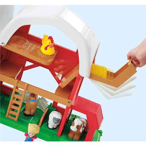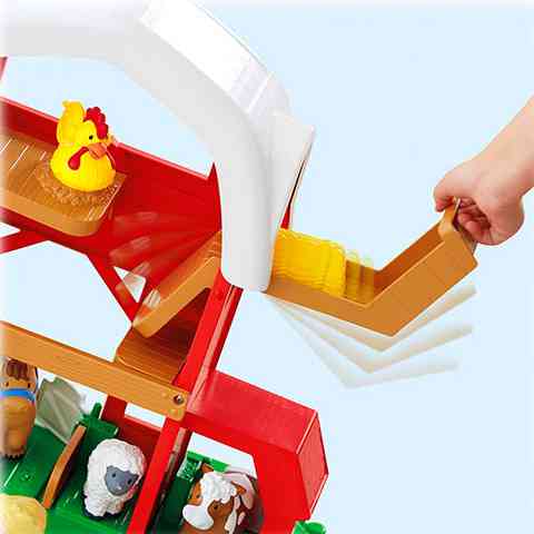Ezzel a mini farmmal most megmutathatja a vidéki élet szépségeit. Ebben a kis pajtában sok minden vár a kicsire amivel el tudja magát szórakoztatni. Az ajtók és ablakok nyithatóak, található itt tekerővel mozgatható kis kakas, csúszda, tároló és néhány figura is. Egy vidéki farmról sem hiányozhatnak az állatok, így a készletben egy boci, egy lovacska, és egy kis bárány is helyett kapott. A gazdálkodásról egy kisfigura farmer gondoskodik, akivel remekül elszórakozhat majd gyermeke. Az élénk színvilág, a remek hangulatú téma mind-mind felhőtlen játékra készteti gyermekét. Sok felfedeznivaló és teendő akad a gyerekeknek. Tehénbőgés, kotkodácsolás, nyerítés, bégetés – élethű hangok hallatszanak, amikor a gondos kis gazdák kinyitják és behajtják az ajtókat az istállóban. A bálázógéppel egészen az épület felső szintén fészkelő kotlósig lehet szállítani a szénabálát, hogy a csirke nyugodt körülmények között költhesse tojásait. A sok-sok teendő alaposan megizzasztja Eddie gazdát és kis segítőjét, míg minden teendőt elintéznek a birtokon! Hisz fel kell építeniük a karámot, át kell pakolniuk a szénát, ki kell engedniük, majd vissza kell terelniük az állatokat, el kell reteszelni a zárakat, és el kell forgatni az ajtókat. A tanyavilágon fényes nappal zajló életről szóló 8 új közösen énekelhető dalocska azonban megkönnyíti a fárasztó munkát! Más dalok és hangok pedig az éjszakai tanyavilágból adnak ízelítőt. A játék darabkái jól tárolhatók a gabonatárolóban, a szülők pedig kényelmesen ki tudják kapcsolni a hangokat a kézhez álló be-ki kapcsoló segítségével, amikor a szorgos kis gazda maga is nyugovóra tér. 2 AA elemmel működik.