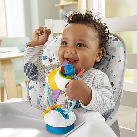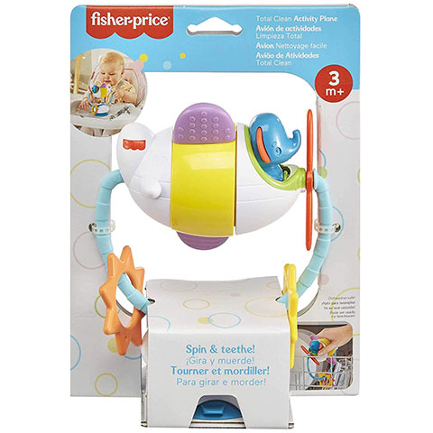 Az etetés néha nyűgös tevékenység, ha a gyermekek türelmetlenül kezelik a helyzetet. Ennek azonban most vége, hiszen az etetőszékre tapadókoronggal rögzíthető Fisher-Price Pörgő-forgó repcsi a legelevenebb gyermek figyelmét is leköti. A színpompás játékban ülő elefánt forgó rotorokkal és pörgő szárnyakkal rendelkező kis repülővel érkezik a babák szórakoztatására, miközben a mozgatható napocska elemek is jól stimulálják a figyelmet. A szem-kéz koordinációt és a finom-motorikus képességeket fejlesztő játék már 3 hónapos kortól remek szórakozást kínál a kicsik számára, a talpról levéve nem csak evés közben. A kiváló minőségű műanyagból készült repülő különböző textúráival és szájba vehető részeivel nem csak a tapintás érzékelést serkentik, de akár rágókaként is működnek, mely által a fogzás idején hatalmas segítséget nyújtanak a gyermekeknek a fájdalom csökkentésében. A játék akár mosogatógépben is tisztítható.