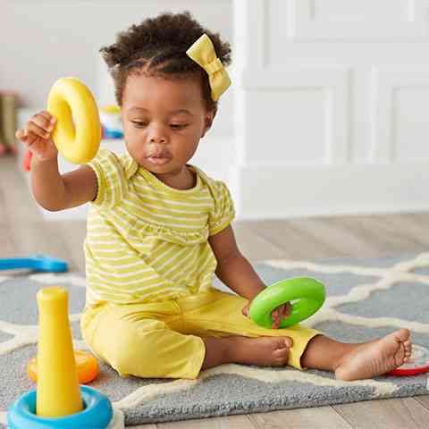 Élén színe miatt is felkelti az érdeklődést, könnyű megfogni a karikákat, az összerakása fejleszti a babák ügyességét.