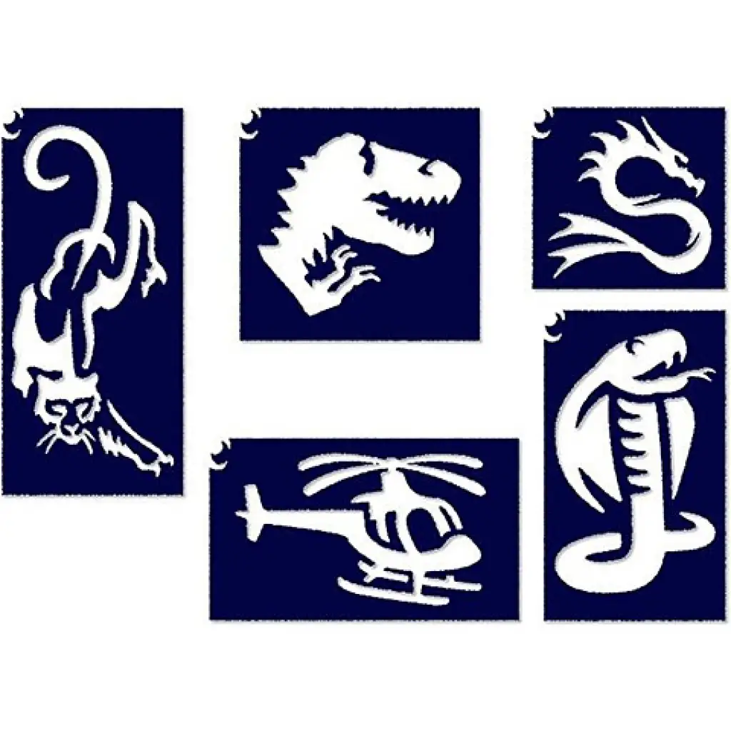 A fiúk is készíthetnek maguknak látványos csillámtetoválást, melyhez ezeket a kis sablon mintákat használhatják alapul. Egyszerűen csak fel kell ragasztani a tetoválás alapot a bőrfelületre, majd arra nekik tetsző csillámot szórni. A megtapadó színekkel azonnal kirajzolódik majd a dinó, helikopter, gepárd, kobra vagy akár sárkány formája is, ami remekül mutat majd a bőrükön!