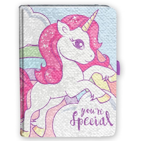 Egy igazán különleges ajándékkal lephetjük meg a kislányokat ennek a naplónak köszönhetően. Az unikornis minta és a lányos színek már önmagukban is gondoskodnak arról, hogy a kislányok örömmel jegyezzék fel a titkaikat ebbe a naplóba, azonban a flitteres felület még egyedibbé varázsolja a napolót, hiszen az egy irányba simított flitterek teljesen más külsőt eredményeznek, mintha a másik irányba simítanánk őket. A napló az A5 méretével kényelmesen elfér bárhol, így mindig kéznél lehet a legfontosabb feljegyzések megtételéhez.