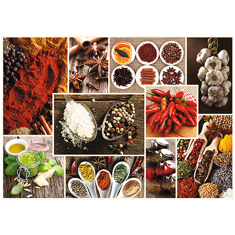 Egy igazán rusztikus kollázst láthatunk a puzzle képén, a legfontosabb fűszerekből, ami kellhet egy konyhába. A kirakós prémium minőségű kartonból készült, melyet egy vékony lakk réteggel fedtek be, hogy még szebben mutasson, és ezáltal strapabíróbbak is a kis darabkák. A színeket természetes forrásból származó anyagokkal hívták elő. A képet kirakva, ragasztó segítségével még a konyha falra is kiakaszthatjuk, és remekül mutat majd. A puzzle-t kirakva egy 68 x 48 cm-es képet kapunk majd.