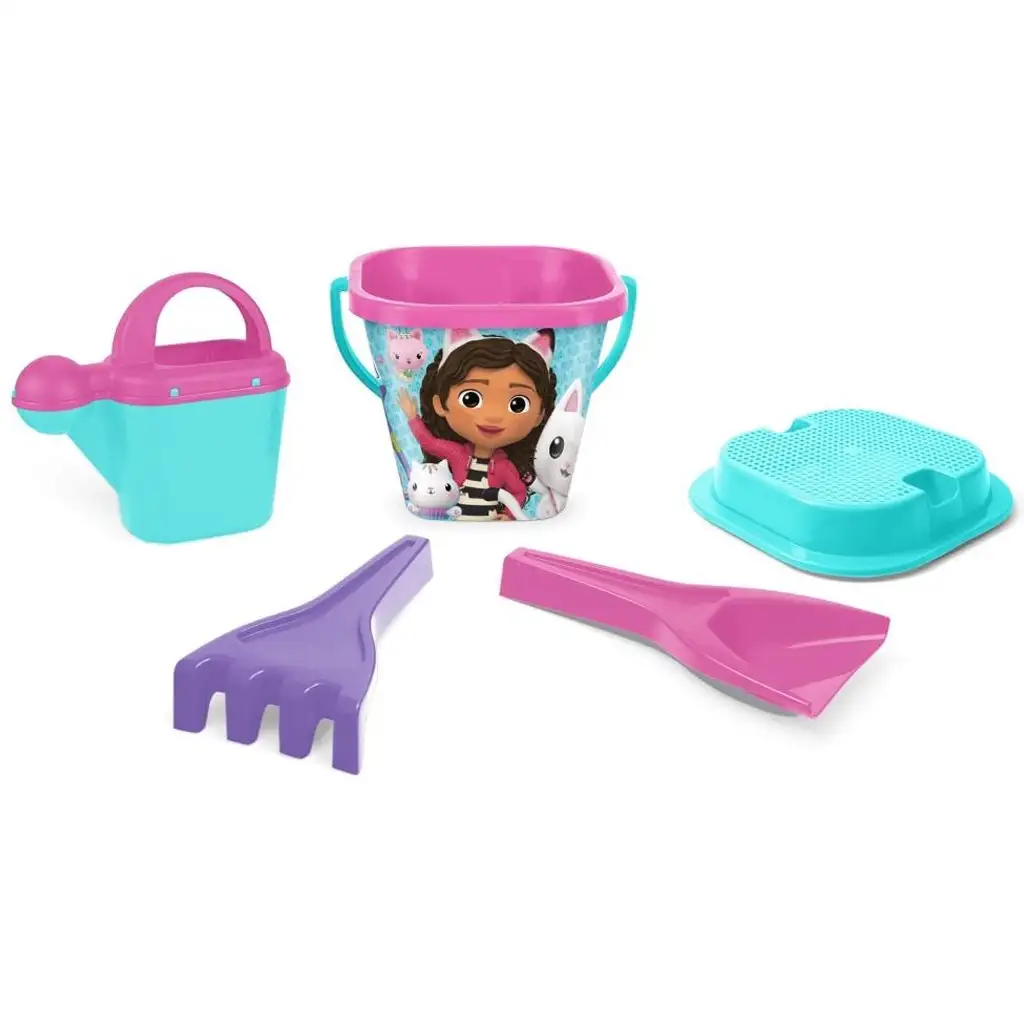 A készlet tartalmaz egy strapabíró vödröt, amelynek oldalán Gabi és barátai láthatók, egy locsolókannát, egy homokozó lapátot, egy gereblyét és egy formázót, amely segít a homokművek megalkotásában. A kiegészítők ergonomikus kialakításuknak köszönhetően kényelmesen illeszkednek a kis kezekbe, így még élvezetesebbé teszik a játékot.