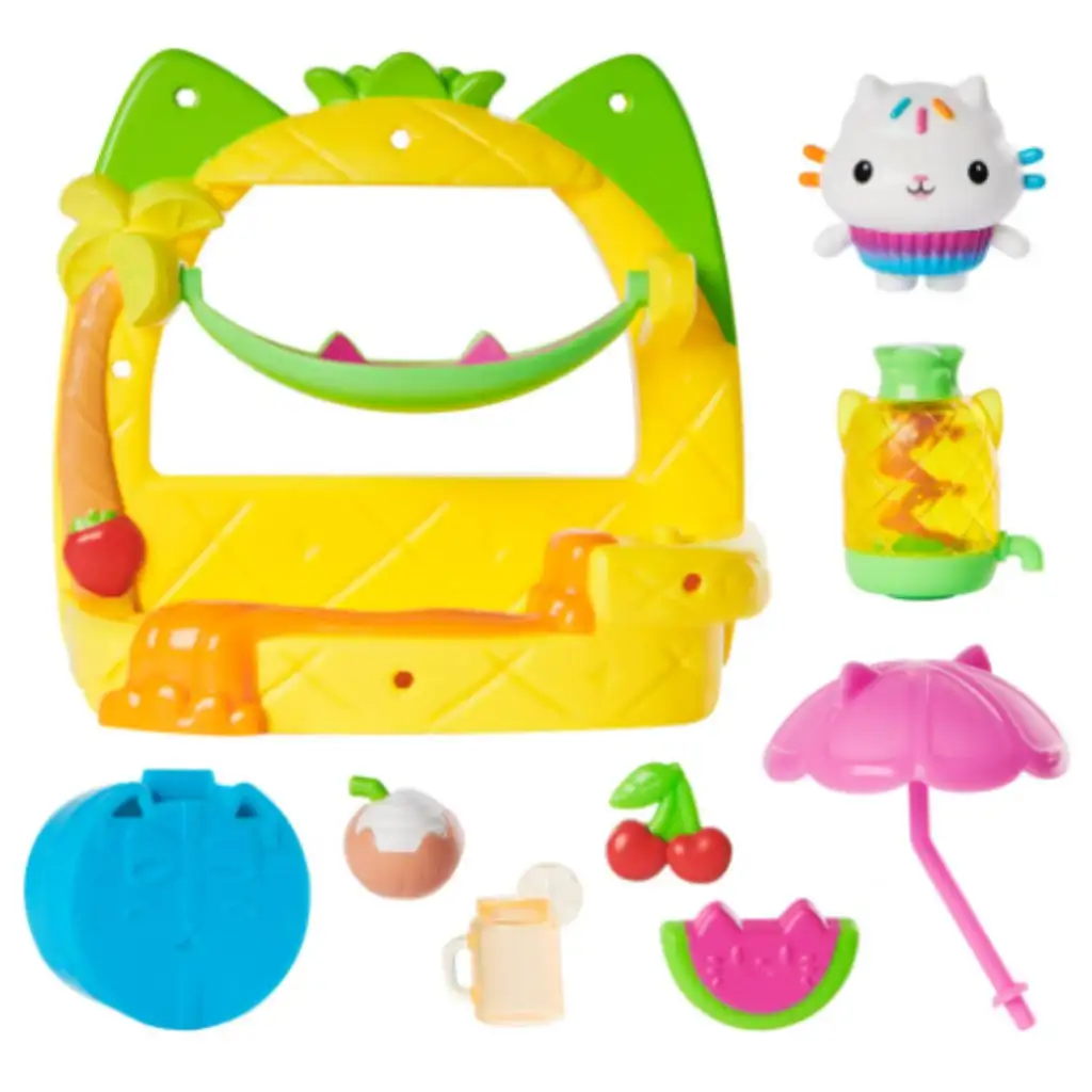 Tartalma: Cakey Cat figura, gyümölcsturmix állomás kiegészítőkkel (ananász turmixgép, napernyő, cseresznye, kókuszdió, limonádé, dinnye szelet), meglepetés kiegészítő